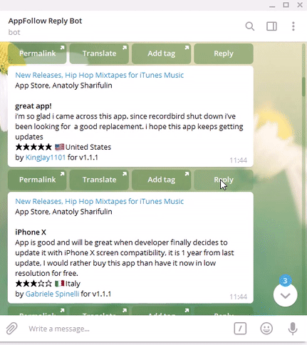 You can talk to app users in Telegram. Use the Telegram Reply Bot to reply to user reviews in chat. It's fast and easy. Add the bot to the team chat to let the whole team reply to users.
