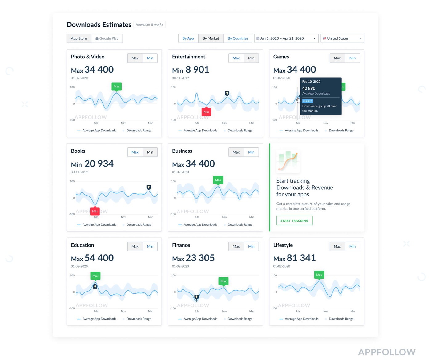 A single dashboard to benchmark your app against market leaders and see how many downloads you need to get to the first place in top charts. Data is divided by country, category, and month.