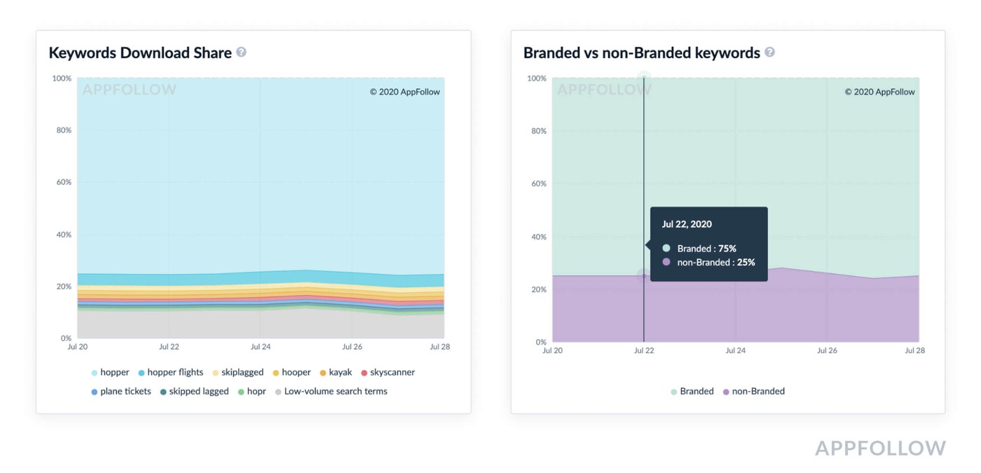 AppFollow will show you all the keywords that generate downloads for a selected app with the download share for every keyword and actual numbers of downloads if you add App Store or Google Play integration. You are able to see what keywords are branded and what are the download share changes during a certain period of time.