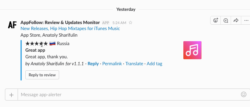 Exactly, now you can reply to your user reviews directly from Slack app. Just set up the integration with iTunes Connect and/or with Google Play Console, add integration with Slack and turn on Reply bot. Voila! The detailed guideline on how to do it is here.