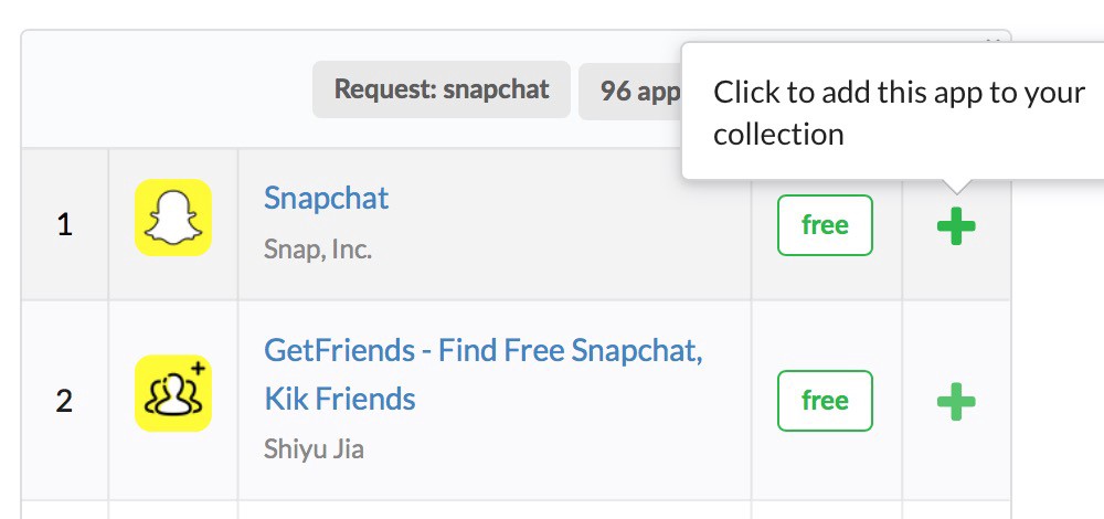 If you’re actively working with ASO Tools, most likely you always notice some apps that worth tracking. Well, add them to your collection right from ASO Tools — just click on a very special green plus next to each app: