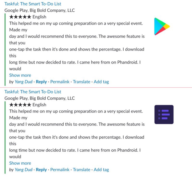 Here’s an example of two reports, one with an App icon and one with a Store icon. You can customize your Slack reports in your account settings: