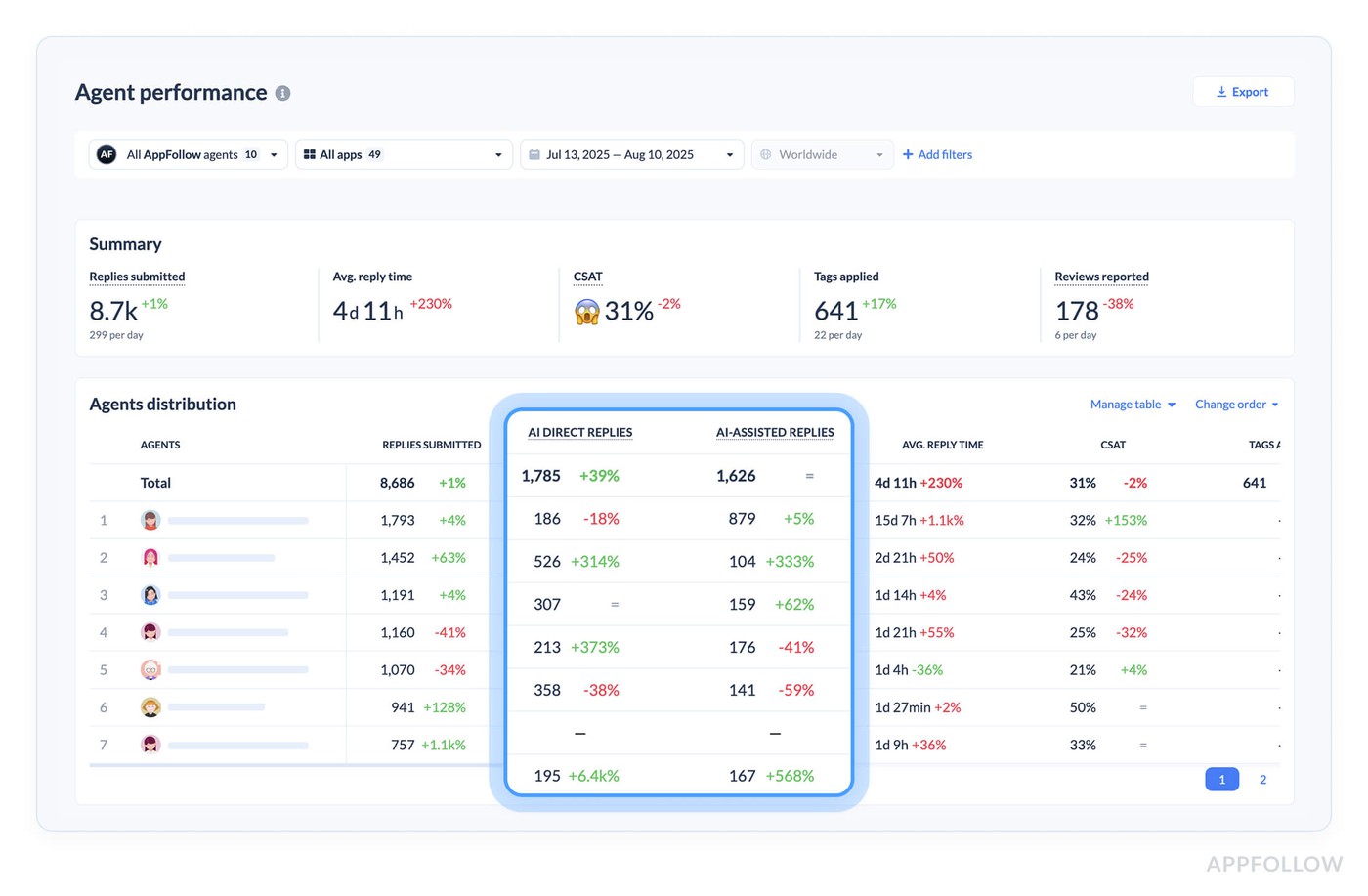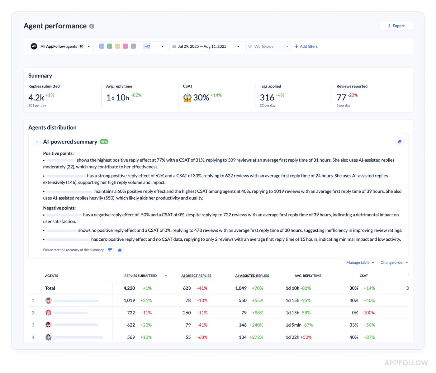 AppFollow tracks three AI usage metrics. AI direct replies shows responses sent without human editing. AI-assisted replies tracks responses where agents used AI but made edits, or used AI tools on manual replies. AI summary for agents analyzes performance data and identifies top 3 positive and negative points in team performance, highlighting contributors and improvement areas in plain language. This gives managers visibility into how teams use automation.