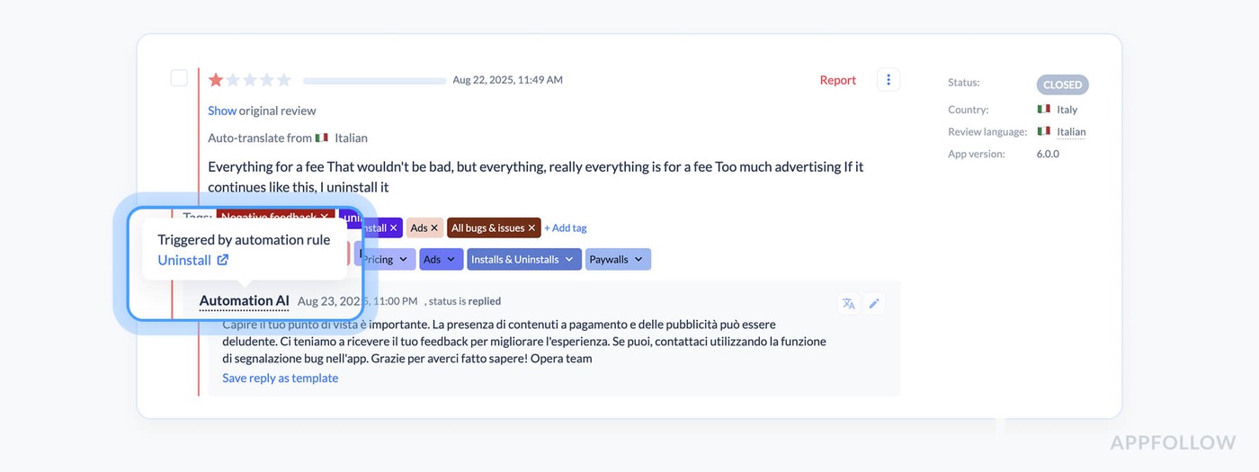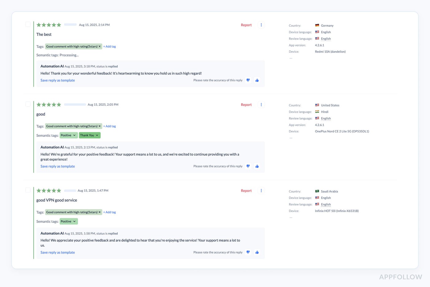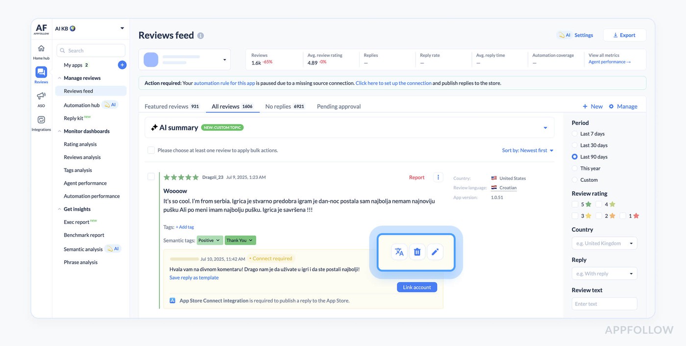 You can manage app store reviews and Trustpilot reviews in a single workspace. Set automation rules based on conditions you define, get instant sentiment scores to identify problems before they escalate, and group reviews by topic to spot trends and address issues systematically.