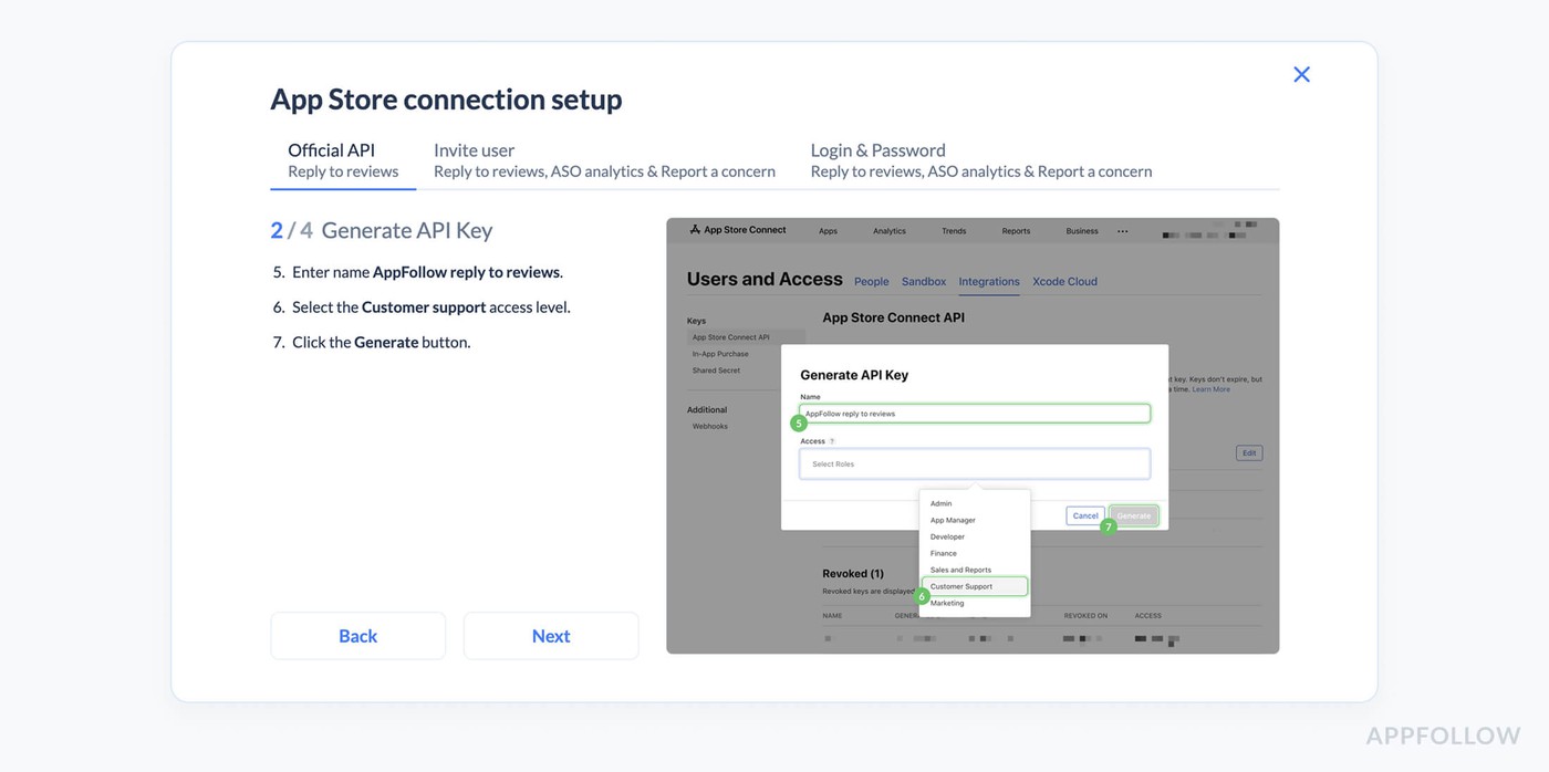 Apple now allows customer support role API keys. These keys only access reviews. Create a customer support key and start replying to App Store reviews immediately.