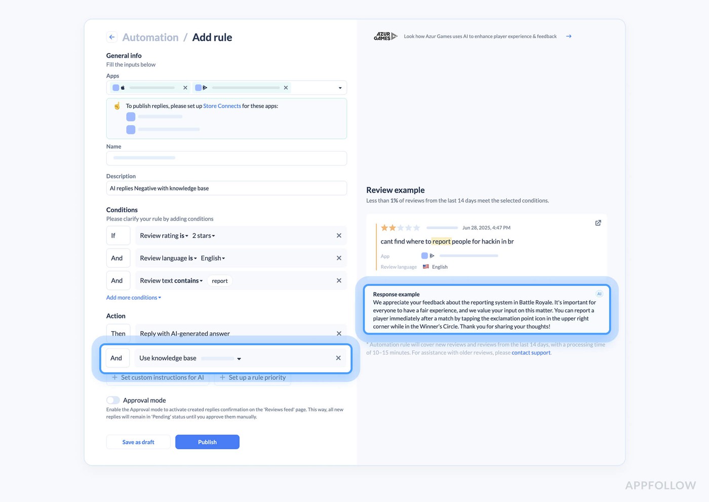 AppFollow's AI knowledge base lets Enterprise customers upload FAQs, help articles, and internal docs that AI uses to craft accurate responses. The AI searches your uploaded documents during generation and applies specific product information to each reply. The system accepts .txt, .pdf, .docx, .md, and .html files. Currently in closed beta for Enterprise customers.