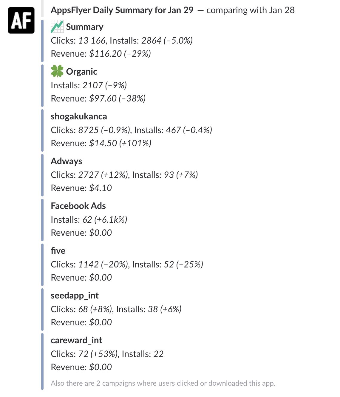 We have good news for mobile marketers who use AppsFlyer. Now you can get reports for all your campaigns including organic traffic and Search Ads right in your Slack. The reports consist of clicks, downloads and sales data.