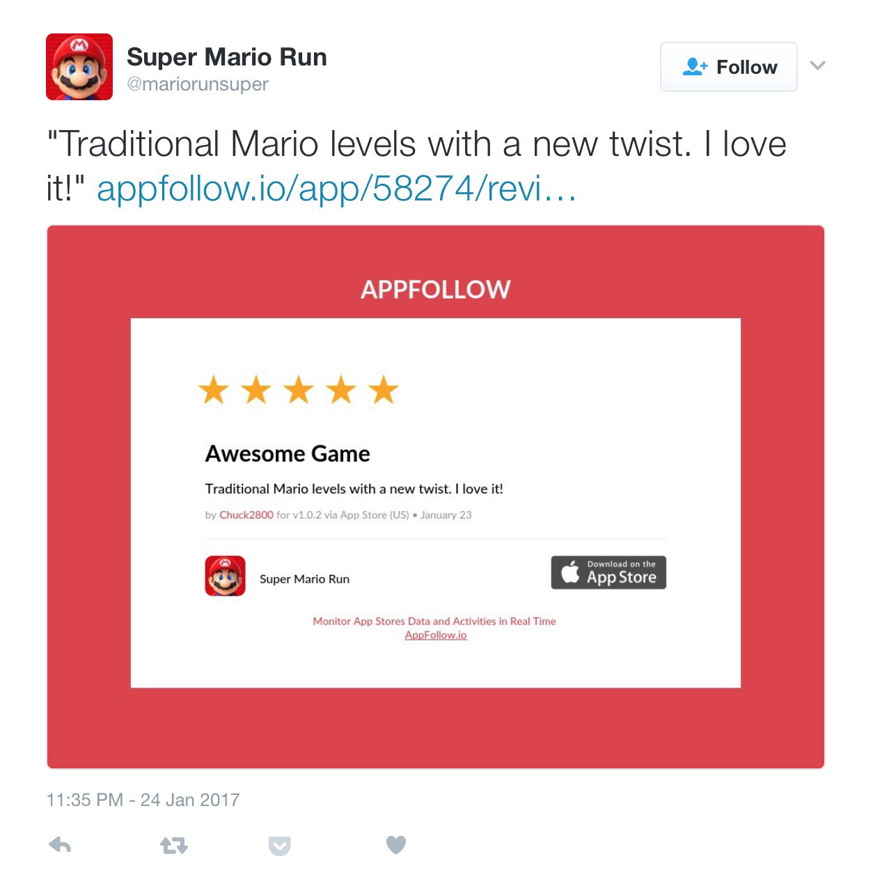 One more great news for marketing and SMM managers. Now you can automatically post positive user reviews on Twitter. It can be a personal page or corporate account or your app account. Have a look at the example: https://twitter.com/mariorunsuper/status/824007656276901889