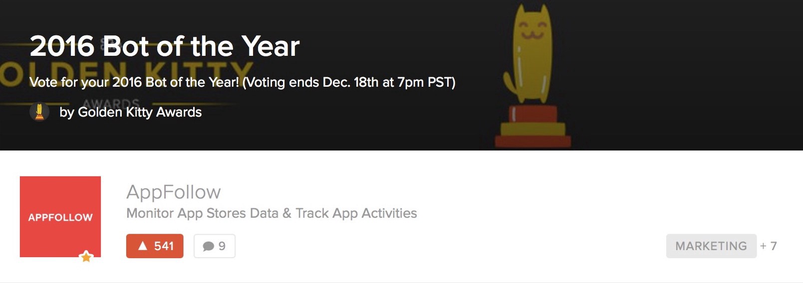 In the end of 2016 we got a nice surprise from Product Hunt. Our bot was nominated for The Best Bot of 2016 award. Even though we didn’t win, we are very happy that our efforts were appreciated in such a nice way.