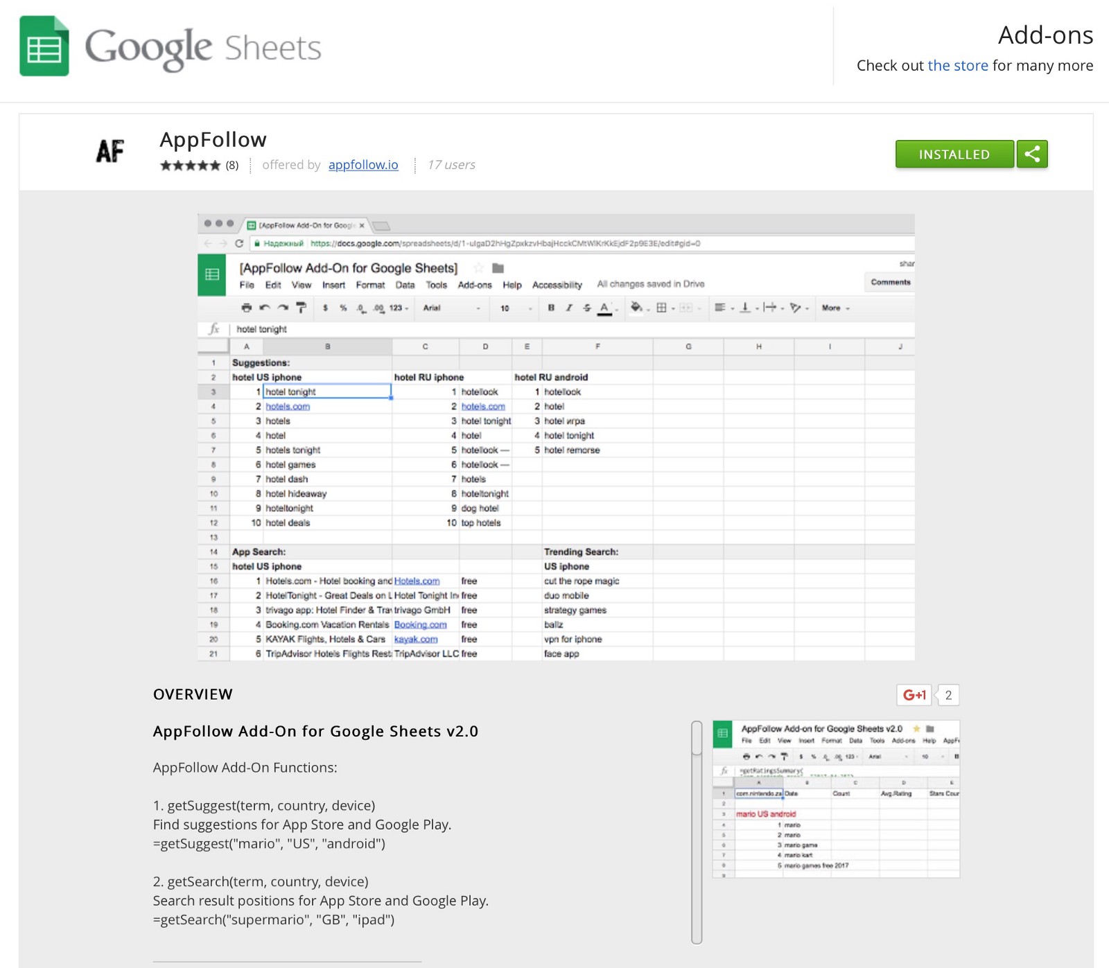 AppFollow offers an easy and convenient way to export suggests — via Google Sheets add-on available for all Google Docs users.
