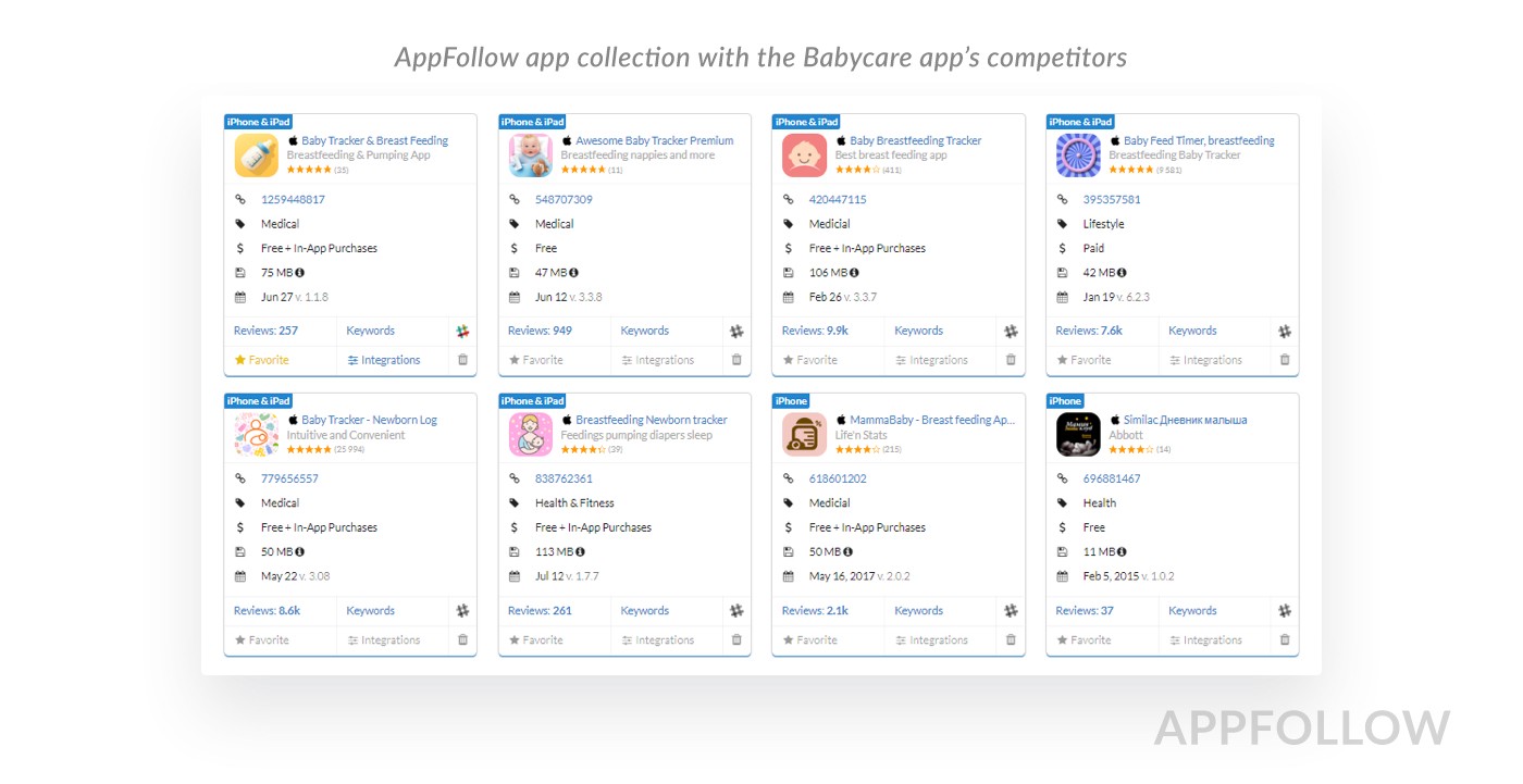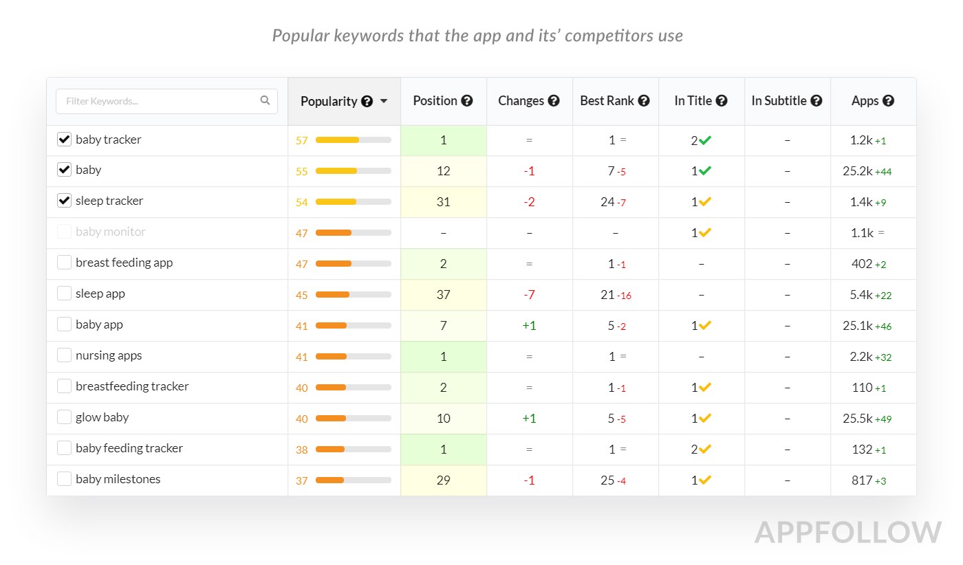 4. Competitors used words such as “baby”, “tracker” and “sleep”. In our example the app has three keywords in the title — Babycare, Breast, and Feeding.