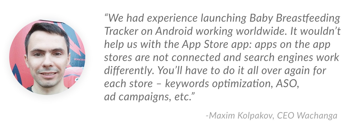 Babycare & Breast Feeding launched in the USA initially. However, this may not work for every app. The US market is tough — more competitors and a high level of entrance will require a lot of energy and money. A good option, which the developers from Wachanga use, will be to focus on launching in other countries to see how you can modify your app’s features and ASO. Then once all possible issues are solved, go and win over the American users.