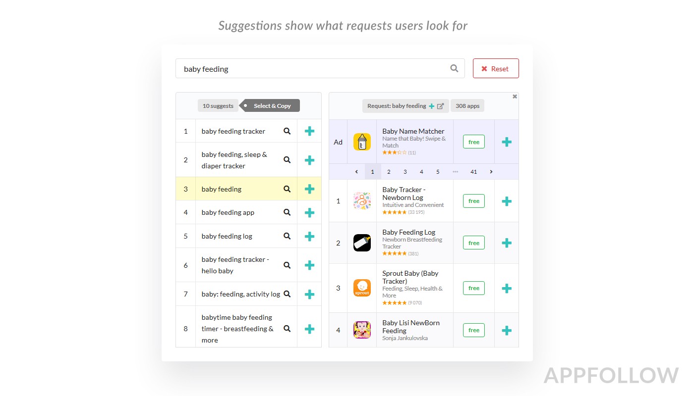 The Suggestions tool imitates Search in the App Store. All popular search requests in any location in one place. Source: appfollow.io