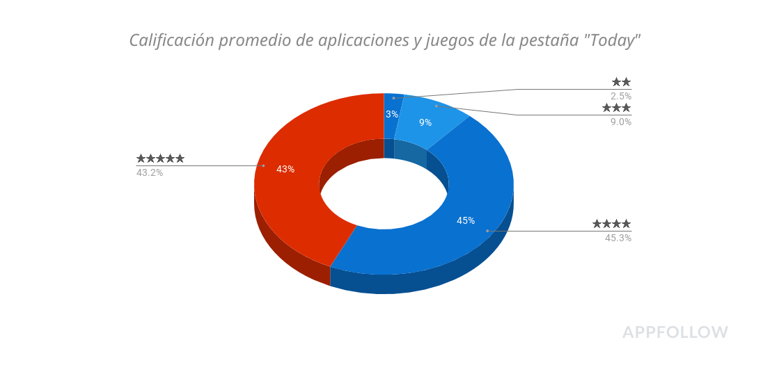 Las aplicaciones con una calificación inferior a 4 estrellas rara vez son consideradas por Apple para ser destacadas. La calificación promedio comienza en 4,2 para las aplicaciones destacadas y en 4,4 para los juegos. Esta es la razón por la que trabajar con la calificación promedio debe ser una de las partes fundamentales de una estrategia ASO para todos los que desean que su aplicación aparezca en la pestaña principal de la App Store.