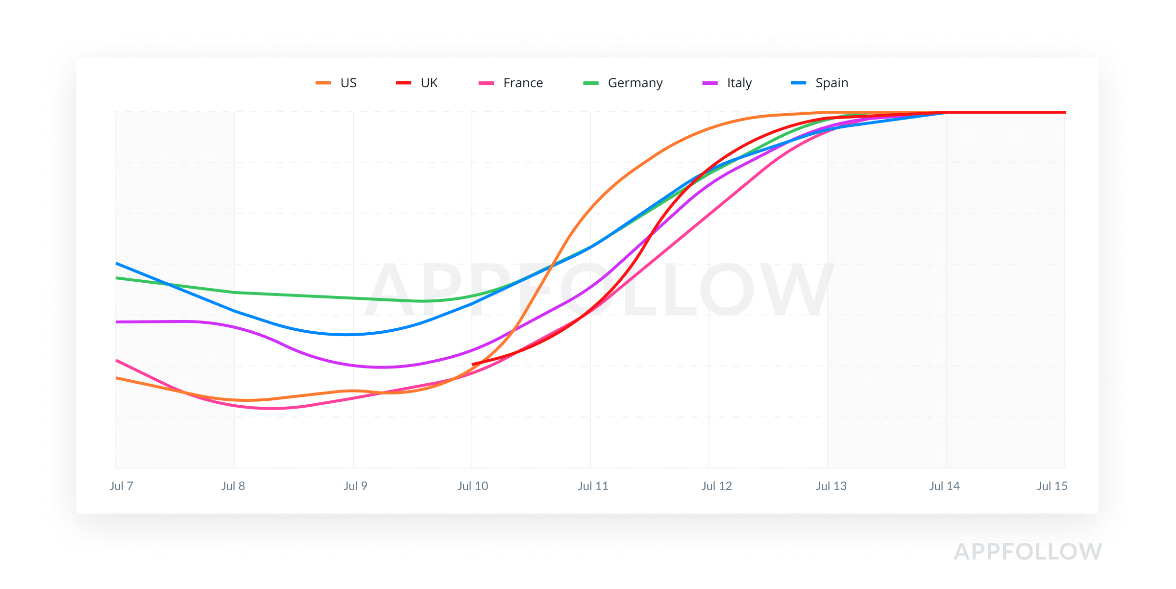 Indeed, in the days leading up to 13th July, in many of the countries taken into consideration, the app was not even in the top thousand of the Android rankings, hence this leap is even more astounding.
