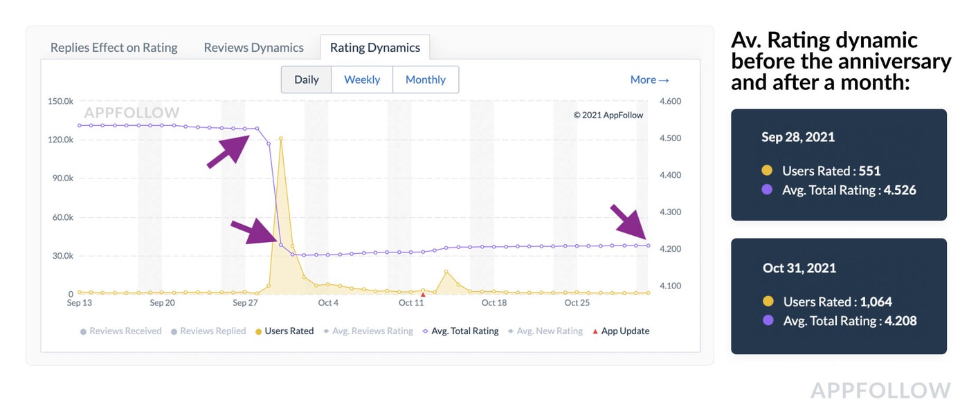 Although the developer did not tackle the reviews at the critical moment of September 28th, only beginning active work with the responses much later — from October 11th, the responses to the feedback had a noticeable influence on the recovery of the app store ratings.
