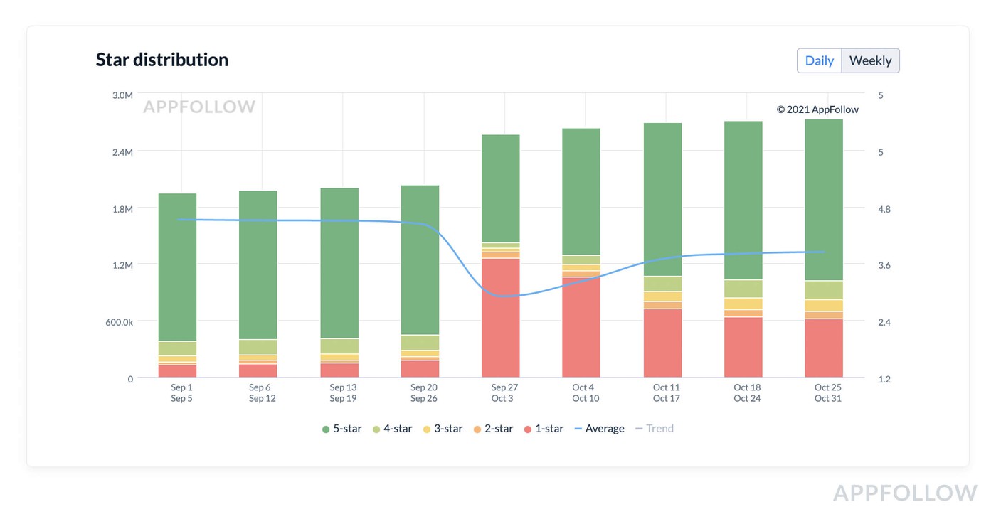 As of October 31st, the overall average rating on Google Play has risen back up to 3.9 but has not recovered its previous rating pre-anniversary— 4.5.
