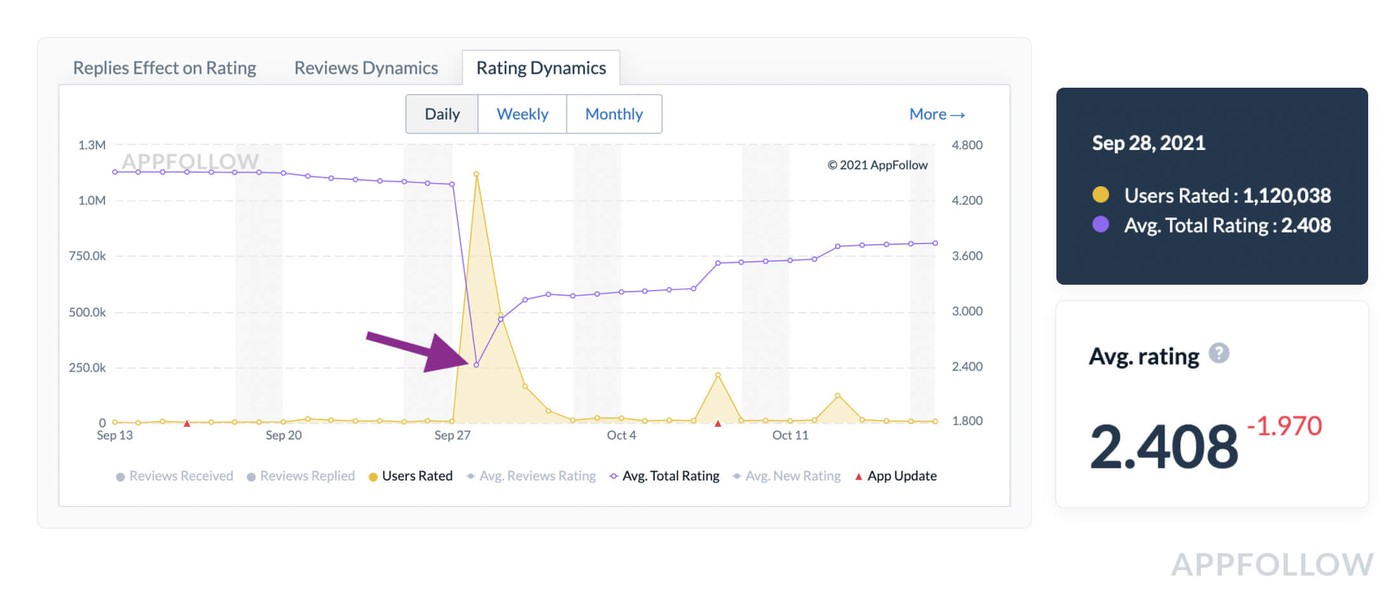 The following day, users left 131,445 reviews with an average review rating of 2.2. And the day after that, the number of reviews exceeded 200,000, which was the highest number of reviews in that period.