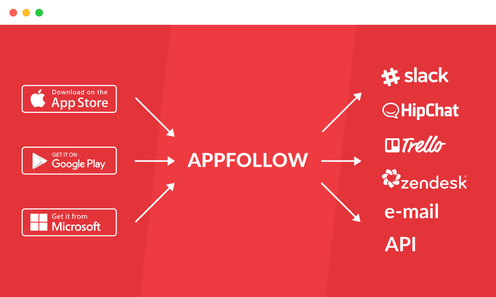 Follow AppFollow news in Twitter, Facebook or Medium, and we will help you to track apps in App Store, Google Play and Windows Phone Store through Slack, HipChat, Zendesk, email and chat-bots.