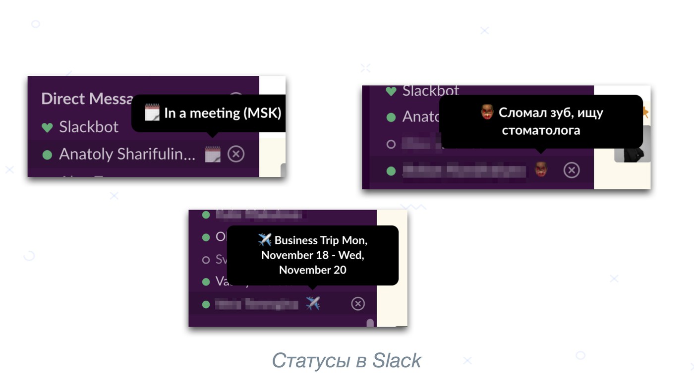 В удалённой команде не так, как в офисе: задал вопрос — получил ответ. Поэтому мы начали вводить простые правила, которые позволяют узнать услышали ли тебя с той стороны или нет. Это все легко делается с помощью реакций в виде emoji и правильных статусов (вспомните ICQ) — в командировке, заболел и т.д.