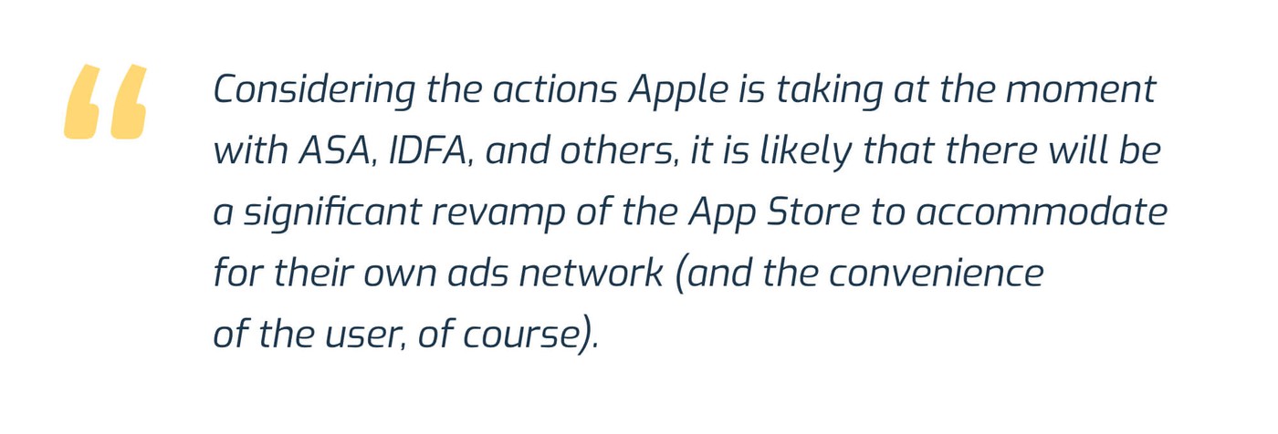 Considering the actions Apple is taking at the moment with ASA, IDFA, and others, it is likely that there will be a significant revamp of the App Store to accommodate their own ads network (and the convenience of the user, of course). Also, did you know that getting a grip on the app store review guidelines is super important for devs?