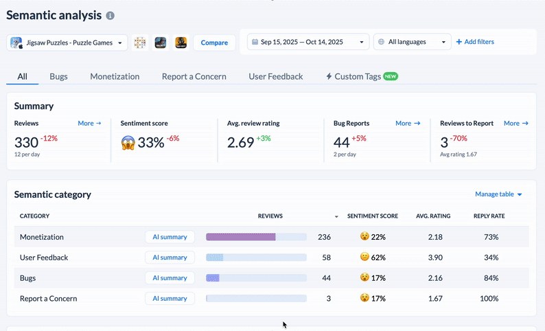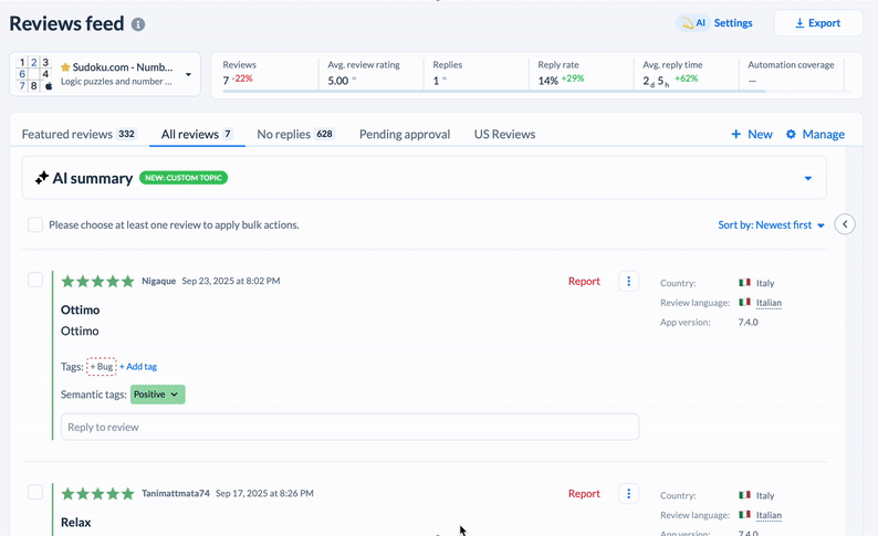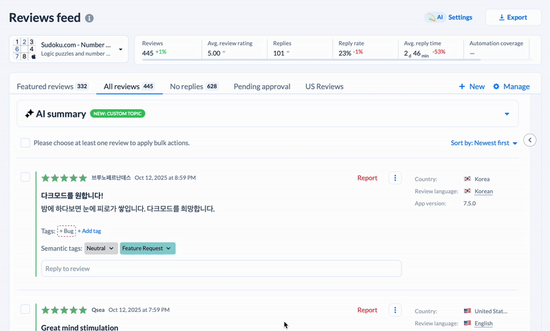 AI Summaries, to start with: instead of reading through hundreds of individual reviews, support teams get instant overviews of what players are saying right now. The AI digests reviews by region, by topic, by whatever filter you need, and tells what’s going on. The summary updates dynamically when you change filters, so you can zoom in on positive reviews from France or negative feedback about level difficulty without drowning in data.