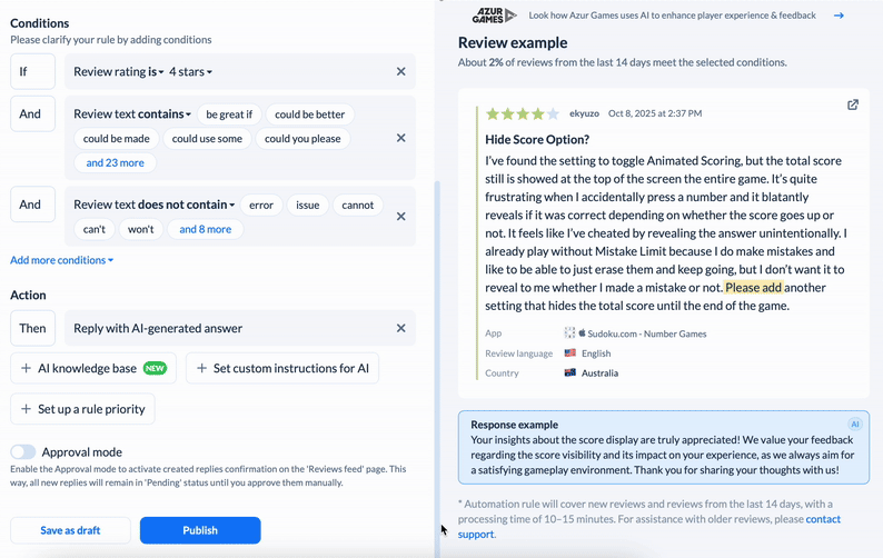 Currently, 35% of their replies use AI assistance, but only 2-3% are fully automated. The rest go through human hands before reaching players. Easybrain operated on manual replies for years, and only recently, with AppFollow's new capabilities, started carefully introducing automation while maintaining their quality standards. Their reply effect sits at +0.43, meaning ratings consistently improve after players receive responses. Focusing on negative reviews, they reply to the vast majority.