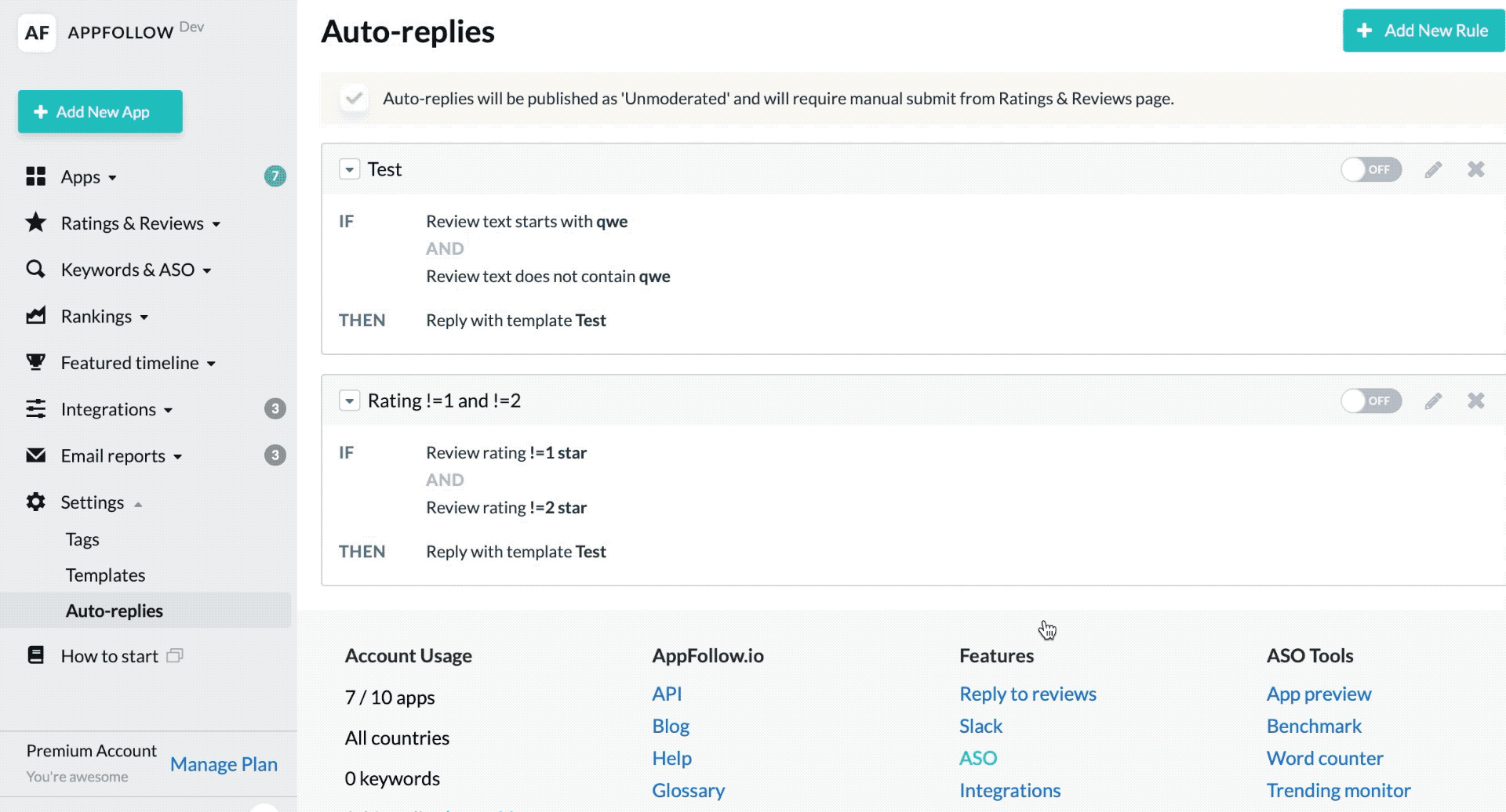 To keep the support team from doing rote work, sending the same reply over and over, AppFollow is launching a new tool: Auto-replies. It can help you close hundreds of tickets with similar problems in seconds and create a positive impression of the developer and their product, even if you don't have 24/7 support.