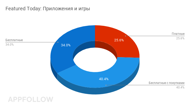 Приложениям проще попасть в подборки, чем играм: их доля за последние полгода составляет 70%. При этом, доля бесплатных приложений 46%, а бесплатных игр — всего 8%.